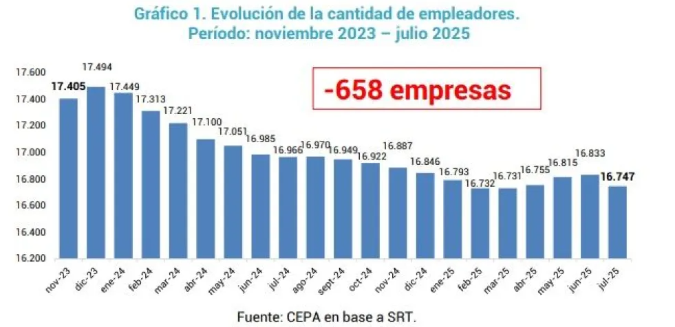 De acuerdo con los datos de la Superintendencia de Riesgos del Trabajo (SRT), entre noviembre de 2023 y julio de 2025 la provincia registró una reducción neta de 658 empresas, lo que equivale a una baja del 3,8% en la cantidad total de empleadores.