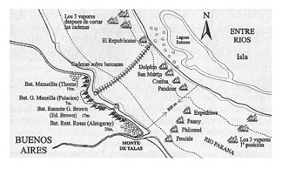 El general Mansilla hizo tender tres gruesas cadenas de costa a costa, sobre 24 lanchones. El 20 de noviembre de 1845 se produjo la Batalla de Vuelta de Obligado contra una flota anglofrancesa muy superior en armamento y hasta con embarcaciones blindadas.