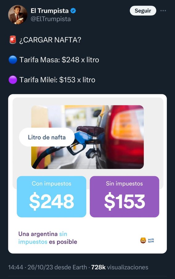 Cuando se instaló al candidato Milei desde los espacios del poder se lo hizo en medio de una campaña de desprestigio del estado en donde se culpaba a este de todos los males de la economía y se prometía un futuro promisorio sin impuestos. Entre los memes circulados desde los trolls centers para imponer estas ideas en el público incauto circulaba uno que al día de hoy, sólo dos años después resulta risible o triste. En el mismo se mencionaba que la nafta super en Buenos Aires estaba a 248 pesos en octubre de 2023, el mes de las elecciones, y sin impuestos con la gestión de Milei iba a estar sólo 153. Hoy, a sólo dos años de esa campaña está 1000 % más que el precio prometido para ganar el voto.