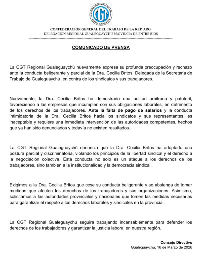 La CGT Regional Gualeguaychú manifestó nuevamente su “profunda preocupación y rechazo” ante lo que consideran una actitud beligerante y parcial de la Dra. Cecilia Britos, delegada de la Secretaría de Trabajo en la ciudad. Según afirmaron desde la entidad, la funcionaria ha demostrado una conducta “arbitraria y patoteril”, favoreciendo a las empresas que incumplen con sus obligaciones laborales y afectando directamente a los sindicatos y sus trabajadores.